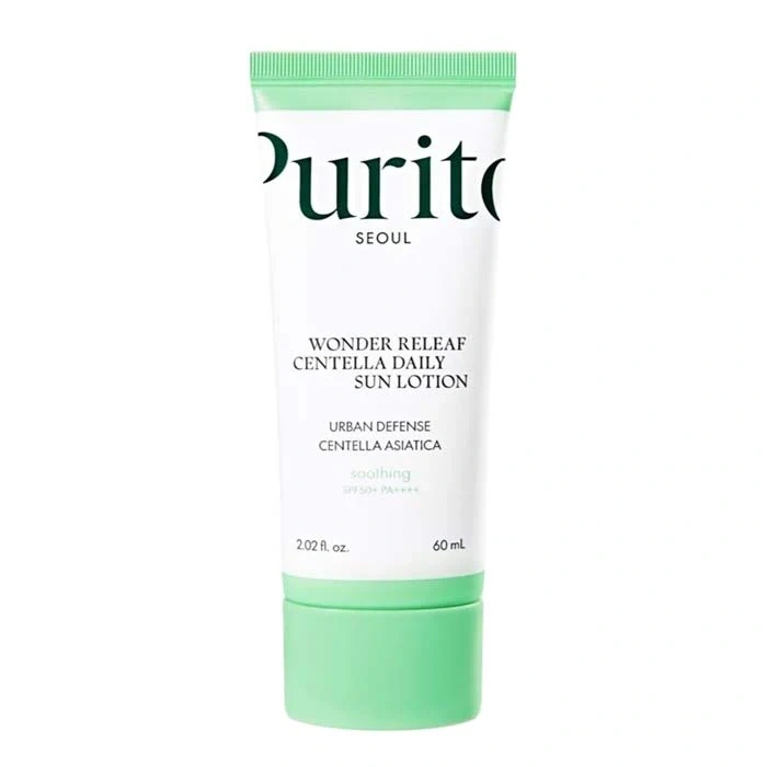 The Wonder Releaf Centella Daily Sun Lotion by PURITO SPF50+/PA++++ provides broad-spectrum UV protection while hydrating and soothing sensitive skin.